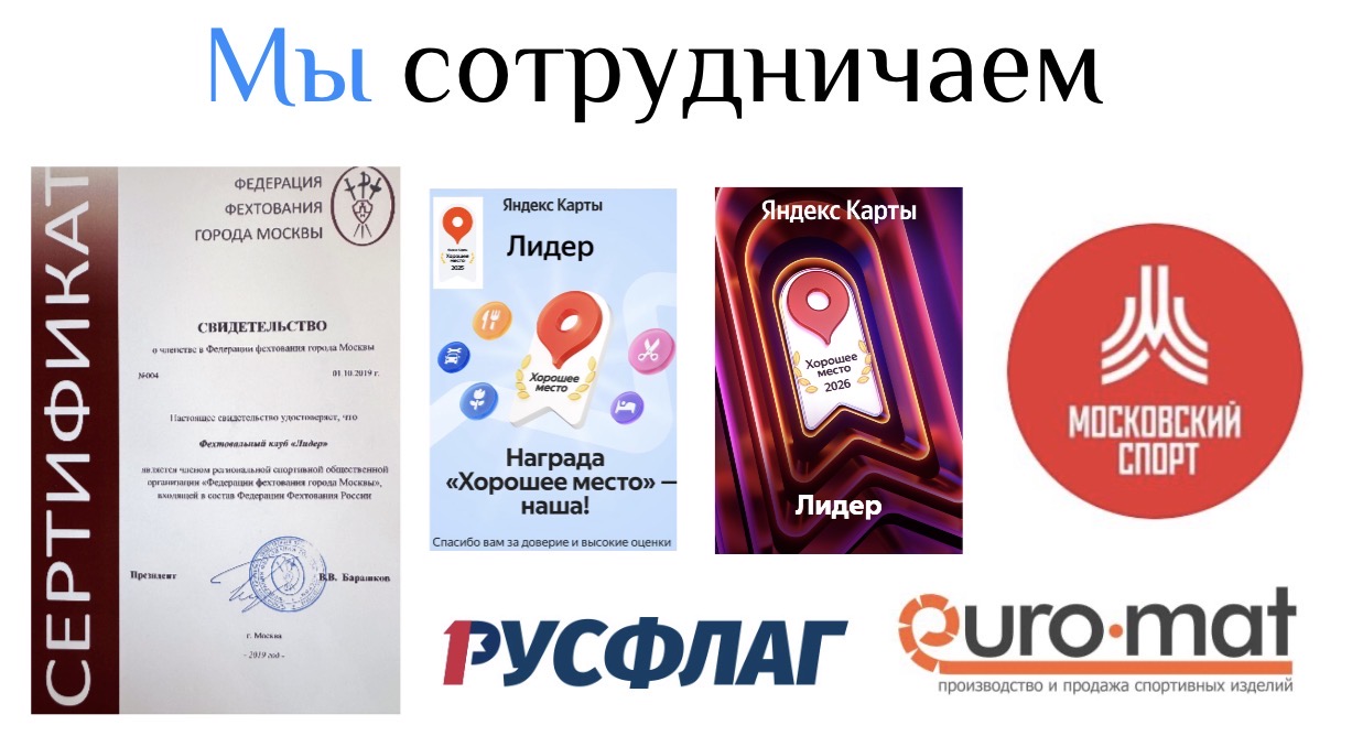 Фехтовальный клуб «Лидер» начал свою работу в 2015 году, зарегистрирован в Федерации фехтования России и Федерации фехтования г.Москвы. Мы являемся профессиональным клубом, проводим тренировки 7 дней в неделю для детей и взрослых: профи, полупрофи, любители. Многие ученики победители Первенства России и Первенства г.Москвы. Наш клуб активно развивающаяся сеть профессиональных залов фехтования в Москве. Мы завоевали доверие многих жителей округа ЦАО (Хамовники, Арбат, Тверской) и не только.